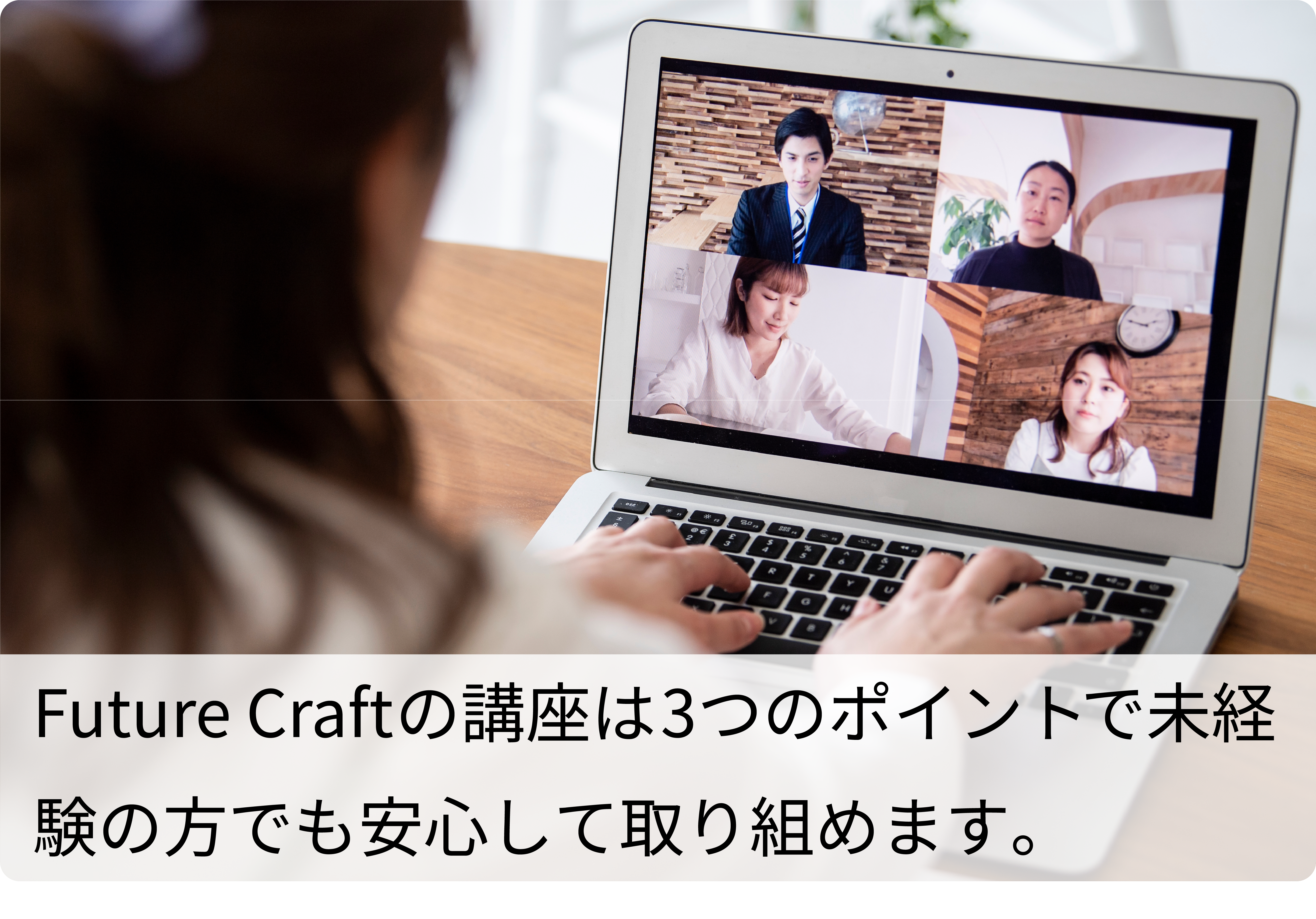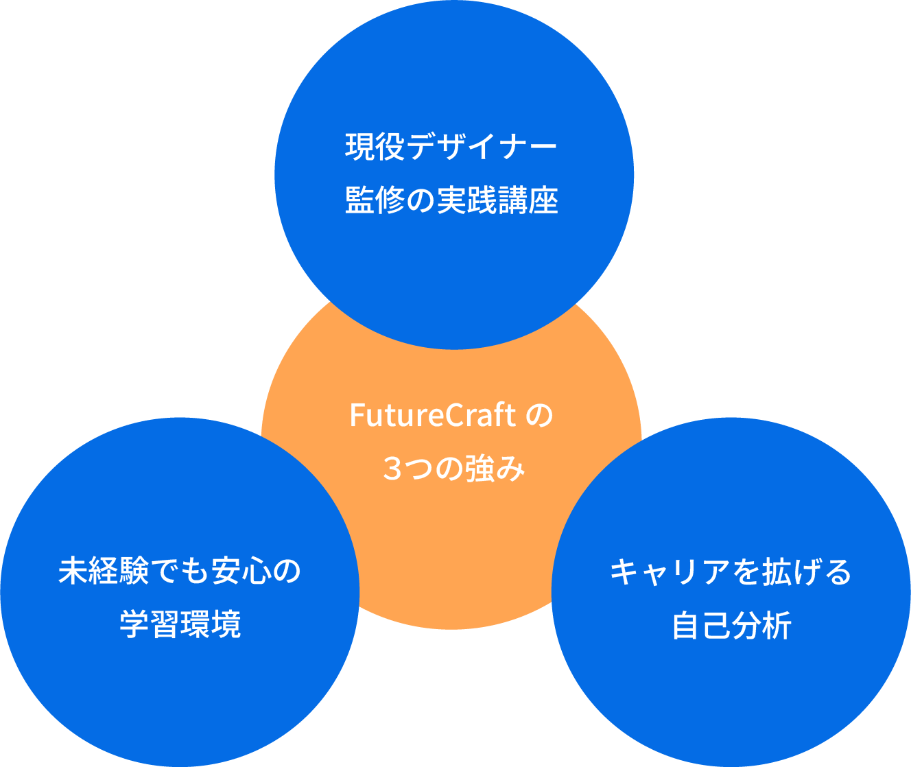 Future Craftには、未経験からでも安心して学べる3つの強みがあります。それは「現役デザイナー監修の実践講座」、「キャリアを拡げる自己分析」、そして 「未経験でも安心の学習環境」 です。スキル習得にとどまらず、自分らしい未来を描く力を育てられるのが、Future Craftならではの特徴です。